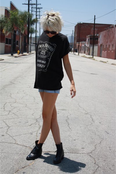 Un T-shirt qui me plait bien, visible sur un site qui se trouve dans la colonne de droite (lequel ? Haha, comme si j'allais le dire ! XD) Il porte sur lui le nom de ma boisson alcoolisée préférée, le "Jacky Danny" héhé :P Les chaussures sont pas mal, c'est normal, ce sont des Dr Martens, et ce sont les plus belles naturellement !! :D L'ensemble, c'est une de mes tenue favorite, pas casse-tête, et tellement classe... le top quoi !